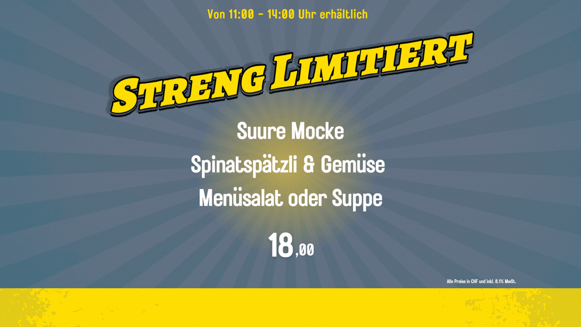 Geniessen sie täglich schnelle und leckere Gerichte wie Pasta, Steak, Burger, Lasagne oder Fischknusperli aus unserer Tageskarte sowie streng limitierte Gerichte.