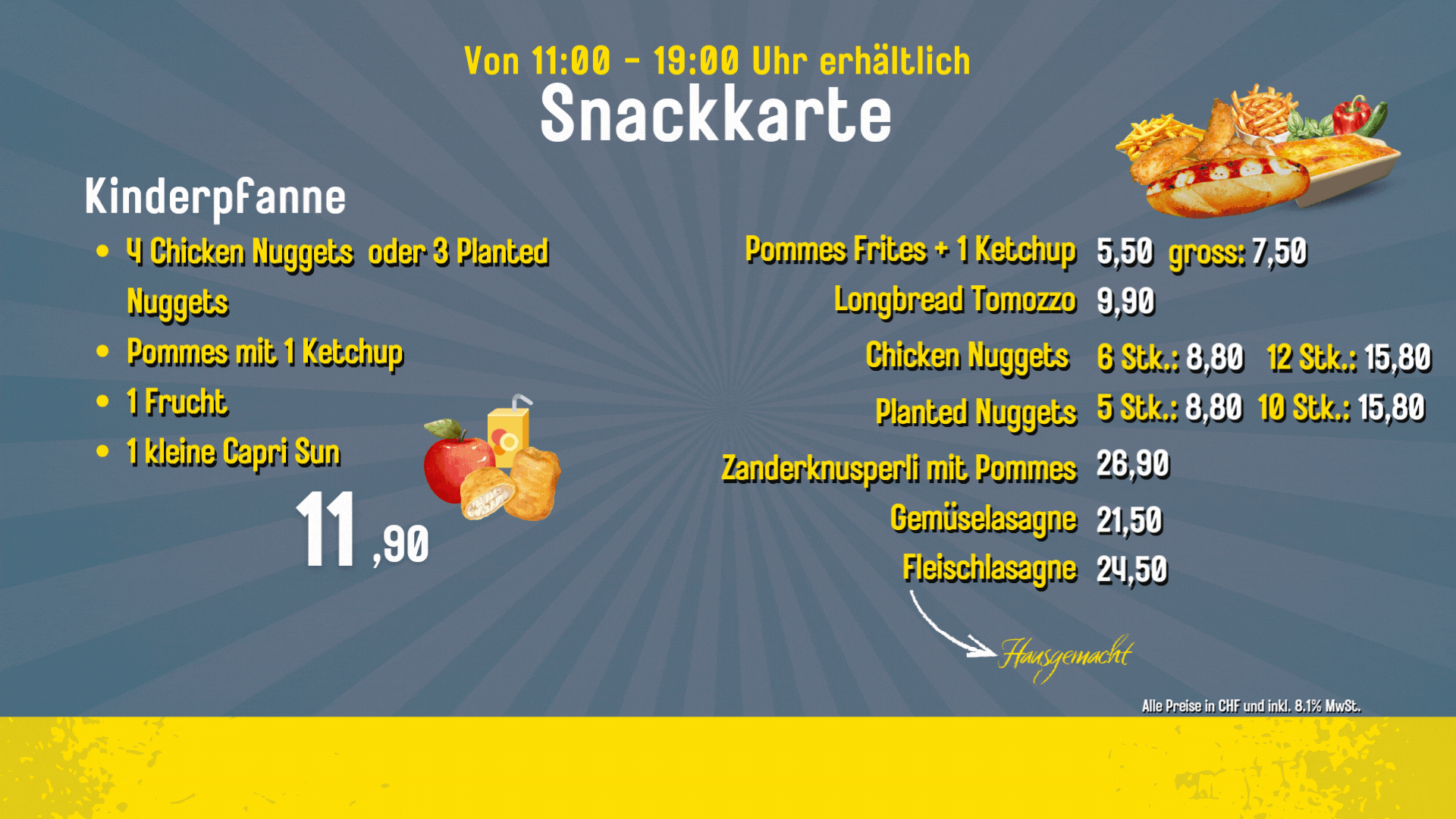 Außerdem: Hausgemachte Lasagne und Leckere Mitnahme-Snacks, wie das beste Birchermüesli im Kanton, frisch zubereitet mit knackigen Äpfeln, cremigem Joghurt und extra-Crunch. Oder unsere hausgemachten Sandwiches, belegt mit frischen Zutaten und in verschiedenen Variationen erhältlich.